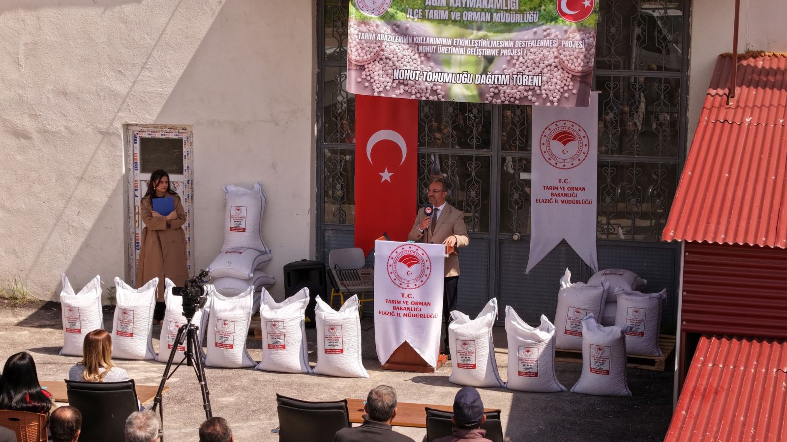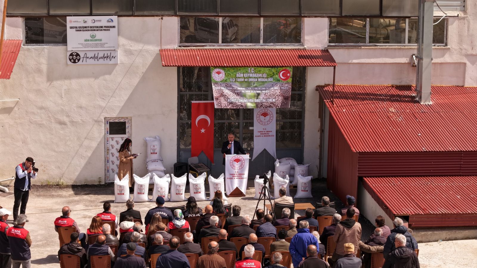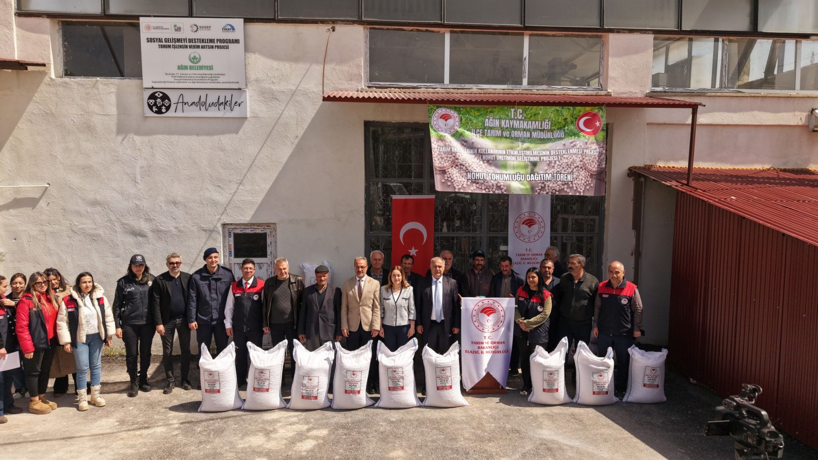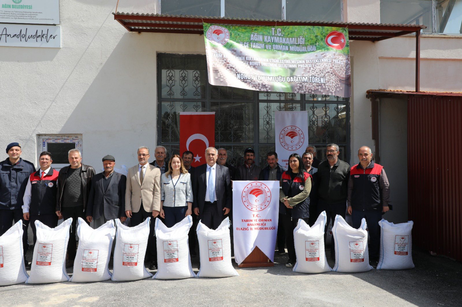 Ağın İlçe Tarım ve Orman Müdürlüğü Bahçesinde 108 Çiftçiye 18 Ton 250 Kilo yüzde 75 Devlet destekli hibeli Ağın çeşidi sarı tüylü nohut tohumu dağıtım program töreni gerçekleştirildi.