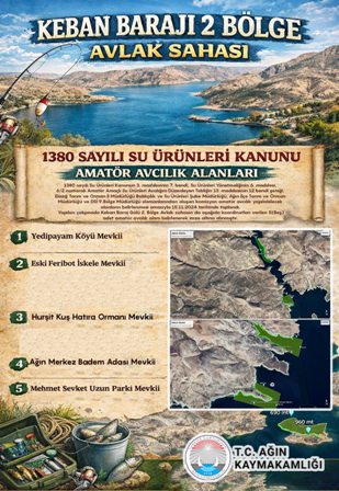 "Keban Barajı 2 Bölge Avlak Sahası Amatör Avcılık Alanları 1380 sayılı Su Ürünleri Kanunun 3. maddesinin 7. bendi, Su Ürünleri Yönetmeliğinin 6. maddesi, 6/2 numaralı Amatör Amaçlı Su Ürünleri Avcılığını Düzenleyen Tebliğin 13. maddesinin 12 bendi gereği; Elazığ Tarım ve Orman İl Müdürlüğü Balıkçılık ve Su Ürünleri Şube Müdürlüğü, Ağın İlçe Tarım ve Orman Müdürlüğü ve DSİ 9.Bölge Müdürlüğü elemanlarından oluşan komisyon amatör avcılık yapılabilecek alanların belirlenmesi amacıyla 15.11.2024 tarihinde toplandı.