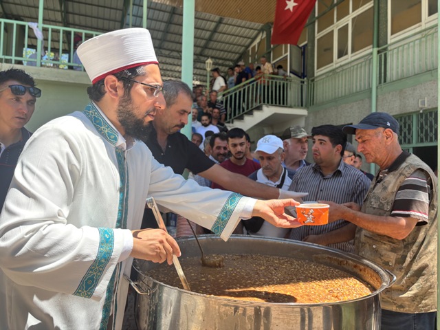 Cuma namazını müteakip gerçekleştirilen ikramda, Kaymakam Kılıçaslan, Belediye Başkanı Cömertoğlu ve İlçe Müftüsü Uyan vatandaşlara aşure dağıtarak etkinliğe birebir katılım sağladı.