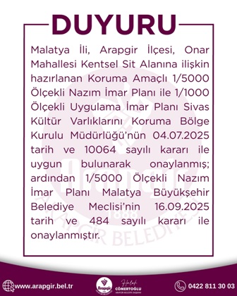 "Malatya İli, Arapgir İlçesi, Onar Mahallesi Kentsel Sit Alanına ilişkin hazırlanan Koruma Amaçlı 1/5000 Ölçekli Nazım İmar Planı ile 1/1000 Ölçekli Uygulama İmar Planı Sivas Kültür Varlıklarını Koruma Bölge Kurulu Müdürlüğü’nün 04.07.2025 tarih ve 10064 sayılı kararı ile uygun bulunarak onaylanmış; ardından 1/5000 Ölçekli Nazım İmar Planı Malatya Büyükşehir Belediye Meclisi’nin 16.09.2025 tarih ve 484 sayılı kararı ile onaylanmıştır.