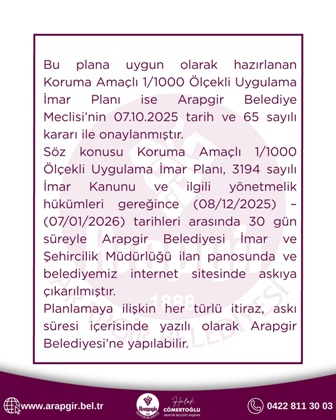 Planlamaya ilişkin her türlü itiraz, askı süresi içerisinde yazılı olarak Arapgir Belediyesi’ne yapılabilir." İfadesi kullanıldı.