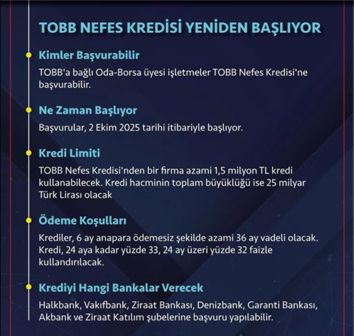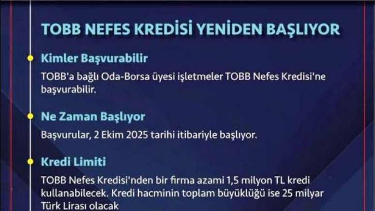 "Odamıza kayıtlı KOBİ üyelerimiz 2 Ekim 2025 tarihinden itibaren kredi başvurusu yapabilecekler. Nefes Kredisi kapsamında bir firmanın azami 1,5 milyon TL’ye kadar kredi kullanabileceğini, kredi hacminin toplam büyüklüğü ise 25 milyar TL olacak.