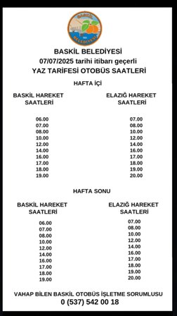 07.07.2025 Gününden itibaren Baskil Belediyesi otobüs saatlerini güncelledi.