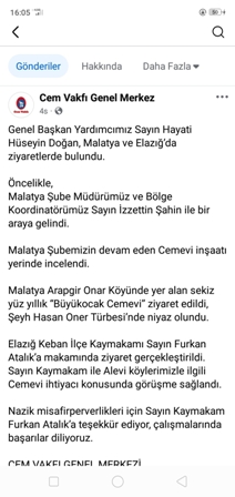 Cem Vakfı Genel Merkezi Keban'da Sayın Kaymakam ile Alevi köylerimizle ilgili Cemevi ihtiyacı konusunda görüşme sağlandığını ifade etti.