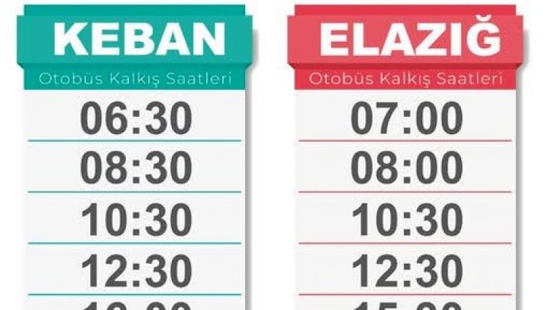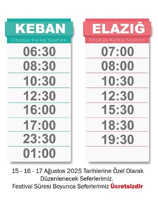 Keban Belediyesi 15-16-17 Ağustosta 2025 günleri İlçe'den Elazığ'dan Festival için gelecek ve gidecekler için Özel Sefer sayı saatlerini artırdı.