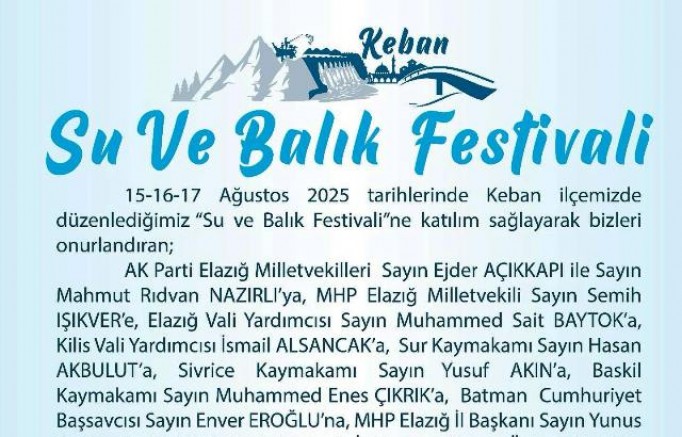 "Keban Su ve Balık Festivalimize katılarak bizlere destek verdiğiniz için teşekkür ederiz. Etkinlik boyunca sergilediğiniz ilgiden dolayı minnettarız.ifadesi kullanıldı.