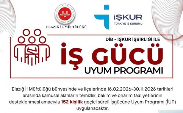 Elazığ İl Müftülüğü bünyesinde ve ilçelerinde 16.02.2026-30.11.2026 tarihleri arasında kamusal alanların temizlik, bakım ve onarım faaliyetlerinin desteklenmesi amacıyla 152 kişilik geçici süreli İşgücüne Uyum Programı (İUP) uygulanacaktır.