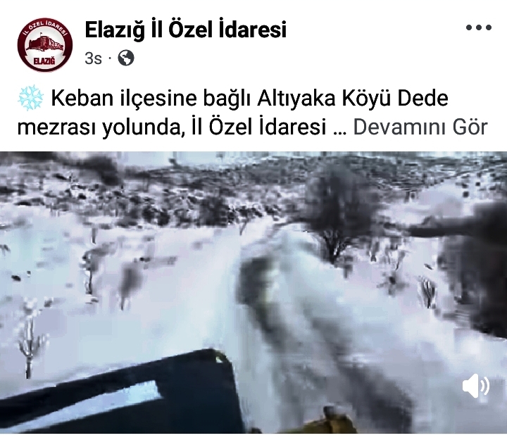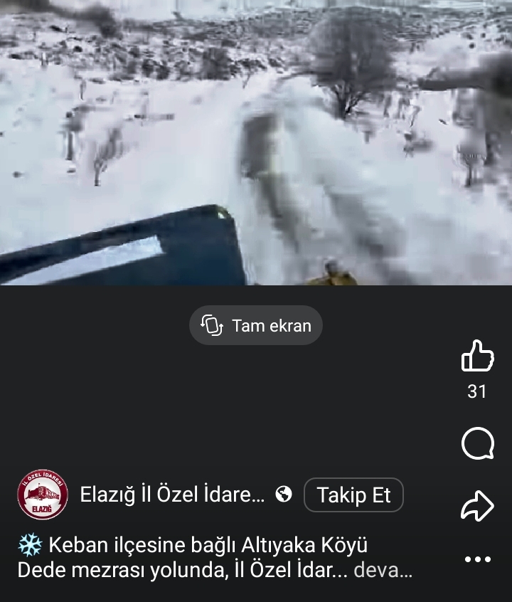 "Keban ilçesine bağlı Altıyaka Köyü Dede mezrası yolunda, İl Özel İdaresi karla mücadele ekiplerimizin çalışmaları sürüyor.yolunda, İl Özel İdaresi karla mücadele ekiplerimizin çalışmaları sürüyor." İfadesi kullanıldı.