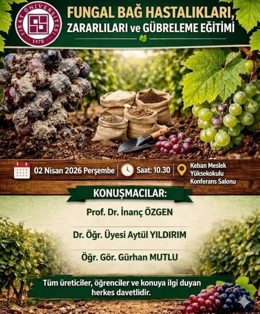 F.Ü. Keban Meslek Yüksekokulu tarafından 2 Nisan 2026 tarihinde, saat 10:00'da Yüksekokulunda Prof.Doç. Dr. İnanç Özgen (DSİ Müdürü Nusret Özgen'in oğlu) Dr. Öğretim Üyesi Aytül Yıldırım,Öğretim Görevlisi Gürhan Mutlu tarafından Fungal Bağ hastalıkları,Zararları ve Gübreleme konusunda konulu bir Sunum ve Bilgilendirme eğitimi verilecektir. Eğitime Tüm Çiftçiler ve İlgi duyan herkes davetlidir.