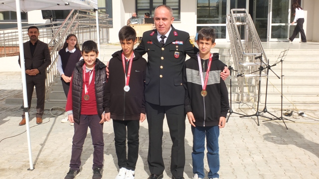 Cumhuriyet Koşusu Erkekler ve Kızlar Spor dalında yarışmalarda dereceye girenlere örgencilere ödüllerini , İlçe Jandarma Komutanı vekili Başçavuş Eyüp Dönmez ve İlçe Emniyet Müdürü Vekili Mahsun Gökmen, verdi.