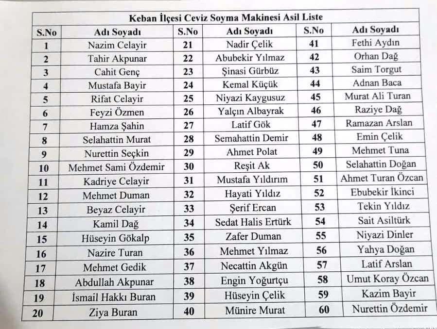 Keban'da %70Hibeli 60 Ceviz Soyma 60 Adet Badem silkeleme Makinesi kura listesi belli oldu