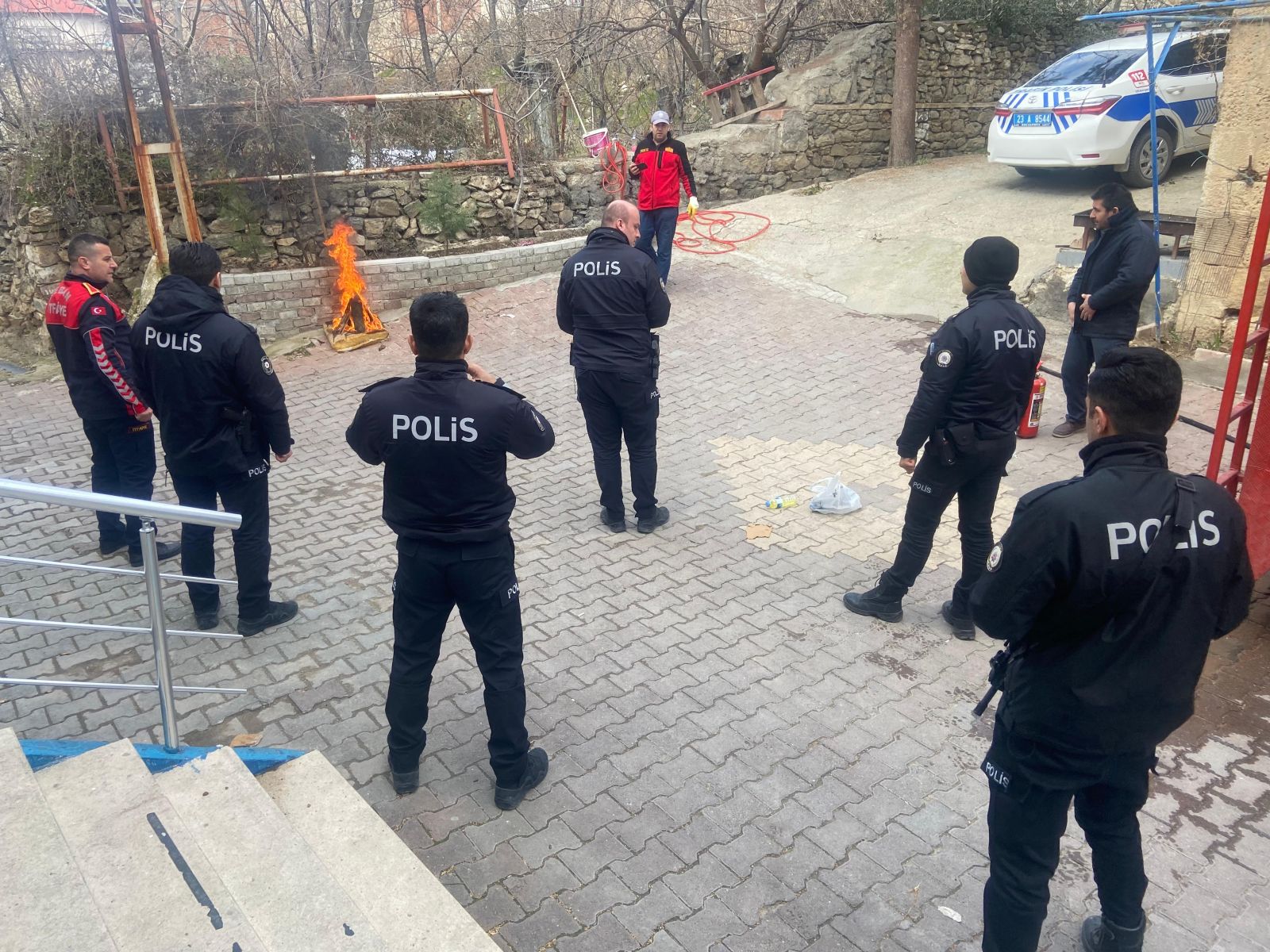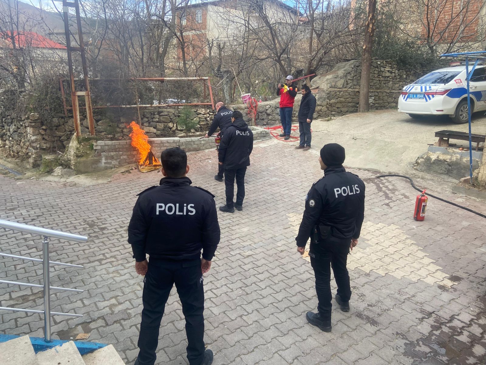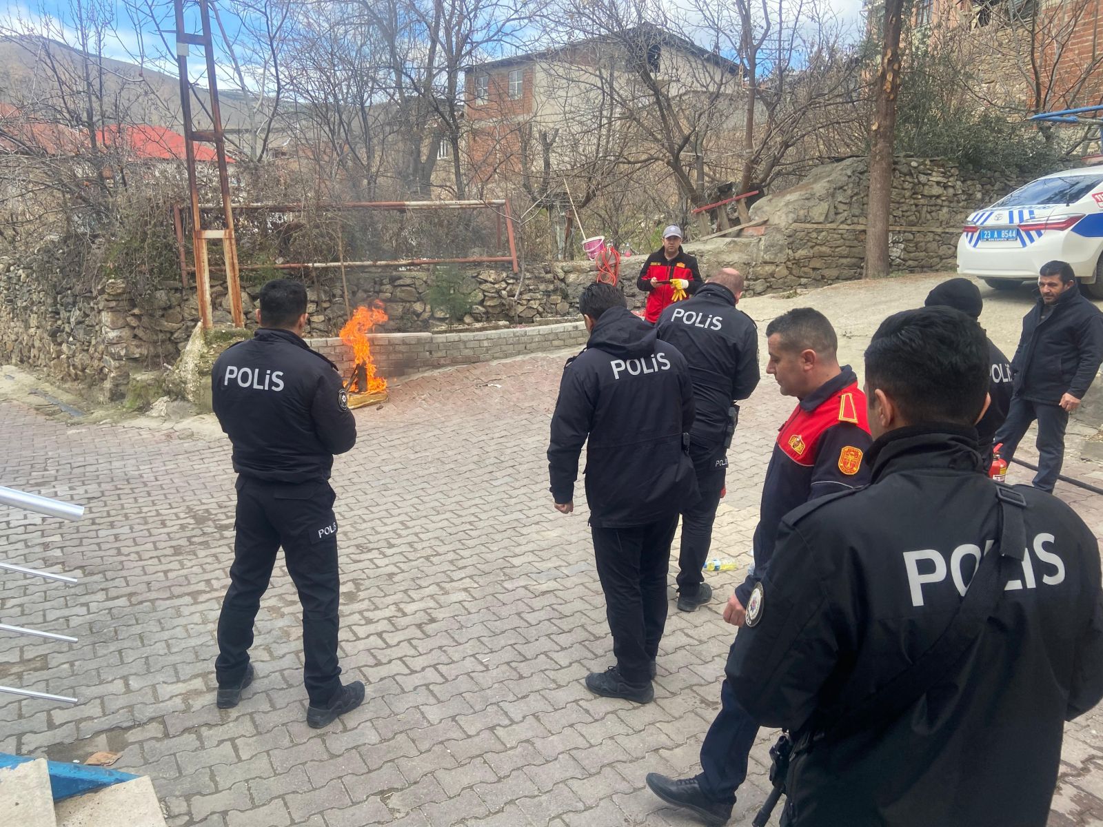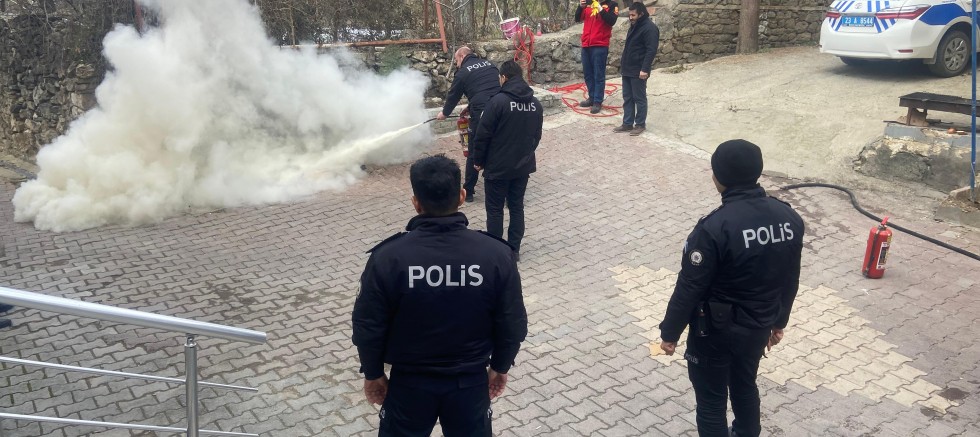 Daha sonra uygulamalı olarak benzin dökülerek yakılan alana emniyet personeli tarafından yangın söndürme tüpleri ile müdahale edildi.