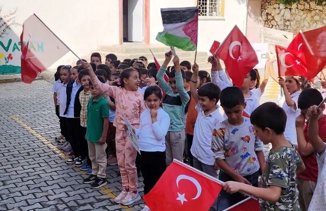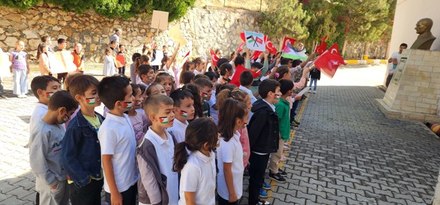 Elazığ'ın Keban İlçesinde Tüm okullar Filistin'deki insan hakları ihlallerinin durdurulması için öğrenciler etkinlik düzenlediler.