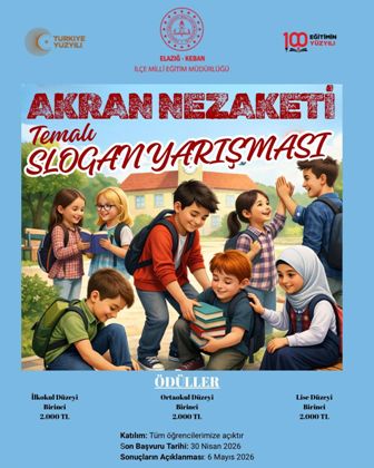 Keban İlçe Millî Eğitim Müdürlüğü "Keban'da Çocuklar Sevgiyle Büyüyor" Projesi kapsamında "Akran Nezaketi" Temalı Slogan Ödüllü Yarışması başladı.