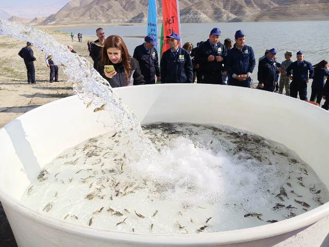 Bu kapsamda, kardeş ülke Azerbaycan Cumhuriyeti Nahçıvan Özerk Cumhuriyeti’ne de 300 Bin adet yavru sazan balığı gönderilerek Haydar Aliyev Su Ambarı’na bırakıldı.