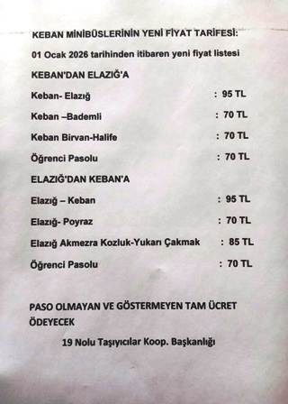 Keban Belediyesi Meclis kararı ile 01 Ocak 2026 gününden itibaren otobüs ücretlerine Keban SS.19 Taşıyıcılar kooperatifine bağlı Keban Minibüsleri ise 01 Ocak 2026 gününden itibaren fiyat güncellemesi yapma kararı aldı.
