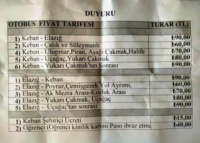 KEBAN MİNİBÜSLERİNİN YENİ FİYAT TARİFESİ: