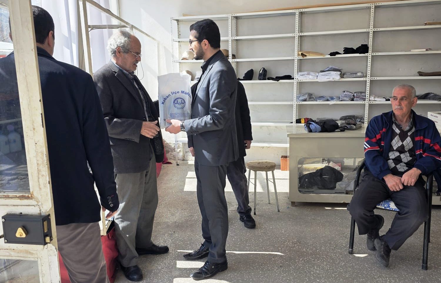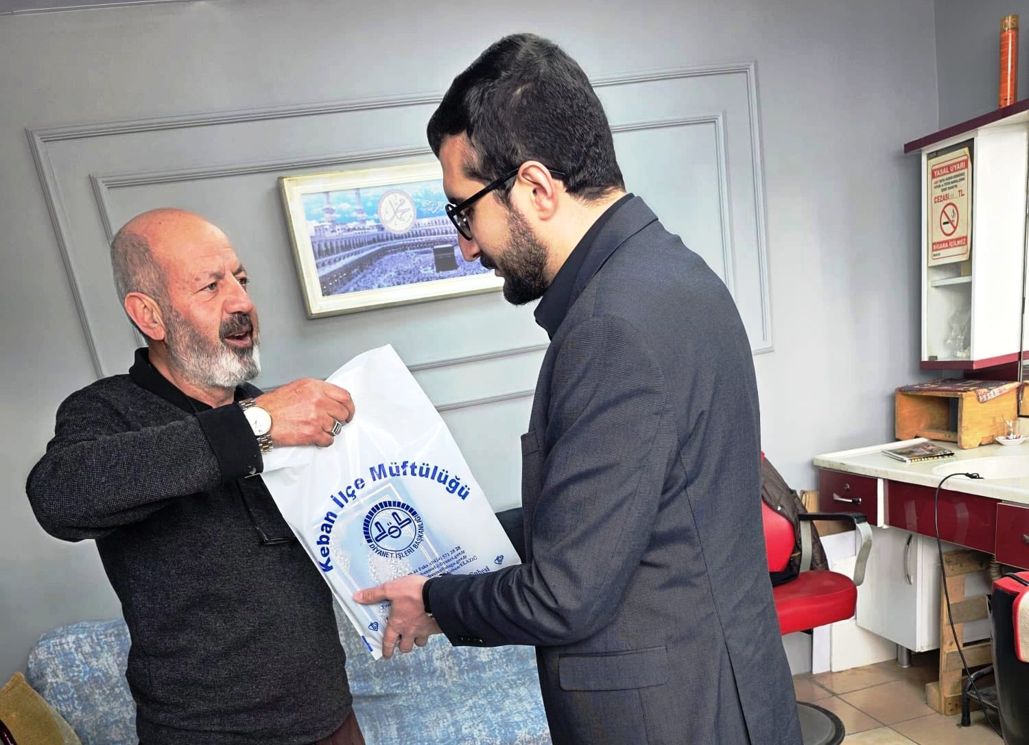 Ziyaret programına katılan Keban İlçe Müftüsü Samet Çiçen tarafından esnaflara Kur’an ve hadis kartelası hediye etti.