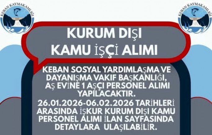 Keban Kaymakamlığı Sosyal Yardımlaşma Vakfı Başkanlığına Aş Evinde çalıştırılmak üzere 1 Aşçı Personeli alımı yapılacaktır.