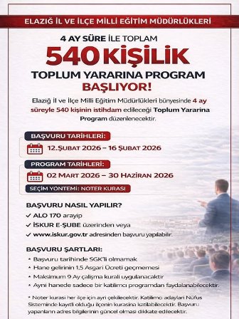 Elazığ İl ve Ağın,Arıcak,Alacakaya,Baskil,Karakoçan,Keban,Kovancılar,Maden,Sivrice,Palu İlçe Millî Eğitim Müdürlükleri bünyesinde 4 ay süreyle uygulanacak 540 kişilik Toplum Yararına Program (TYP) başlıyor. Program kapsamında 540 kişi istihdam edilecek.