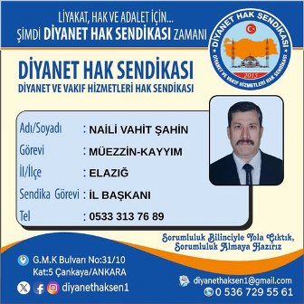 İl teşkilatlanma çalışmasını tamamlayarak Diyanet Hak Sendikası Elazığ İl Başkanlığı görevini tevdi ettiğimiz Naili Vahit Şahin başkanımıza hayırlı olsun diyor, tebrik ediyoruz.