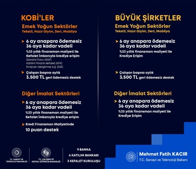İmalat sanayine yönelik yeni bir finansman programının da devreye alındığını açıklayan Milletvekili Keleş, bankalarla birlikte hazırlanan ve 100 milyar lira büyüklüğe sahip finansman programının imzalandığını belirtti. Program kapsamında KOBİ’ler ve büyük ölçekli firmaların, bir aylık istihdam maliyetleriyle orantılı olarak 50 milyon liraya kadar krediye erişebileceğini kaydeden Keleş, kredilerin 6 ay anapara ödemesiz ve 36 aya kadar vadeli olacağını ifade etti. Yıllık finansman maliyetinin yüzde 33 olarak belirlendiğini, KOBİ’lere kefalet desteği de sunulacağını söyledi.