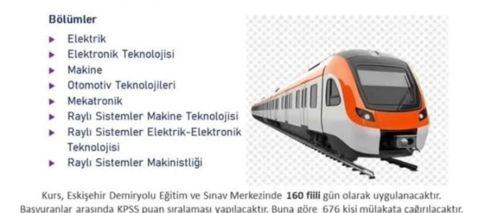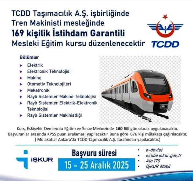 169 kişilik kontenjanla istihdam garantili Tren Makinisti Mesleki Eğitim Kursu düzenlenecektir. Kurs sürecini başarıyla tamamlayan adaylar, tren makinisti unvanıyla istihdam edilecektir.