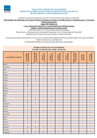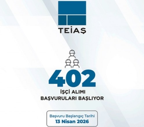 TEİAŞ işyerlerinin 4857 sayılı İş Kanunu'na tabi eleman ihtiyacının karşılanabilmesi amacıyla 402 işçi personelin (324'ü Elektrik, 40'ı Elektronik, 14'ü İnşaat, 8'i Harita, 4'ü Makine, 2'si Kimya, 2'si Sıhhi Tesisat, 1'i Teknik Ressam ve 1'i Kaynak Teknikeri olmak üzere toplam 396 Tekniker ile 3 Aşçı, 2 Resepsiyon Görevlisi, ve 1 Garson olmak üzere Önlisans mezunu toplam 6 yardımcı hizmetlerde görev alacak personel) Türkiye İş Kurumu kanalıyla işe alınması, Yönetim Kurulunun 17.03.2026 tarihli ve 8-56 sayılı kararı ile uygun görülmüş olup eleman alınacak iller ve aranılan niteliklerle ilgili bilgilendirmenin yer aldığı ilan aşağıda yer almaktadır. Bilgilerinize sunulur." İfadesi kullanıldı.