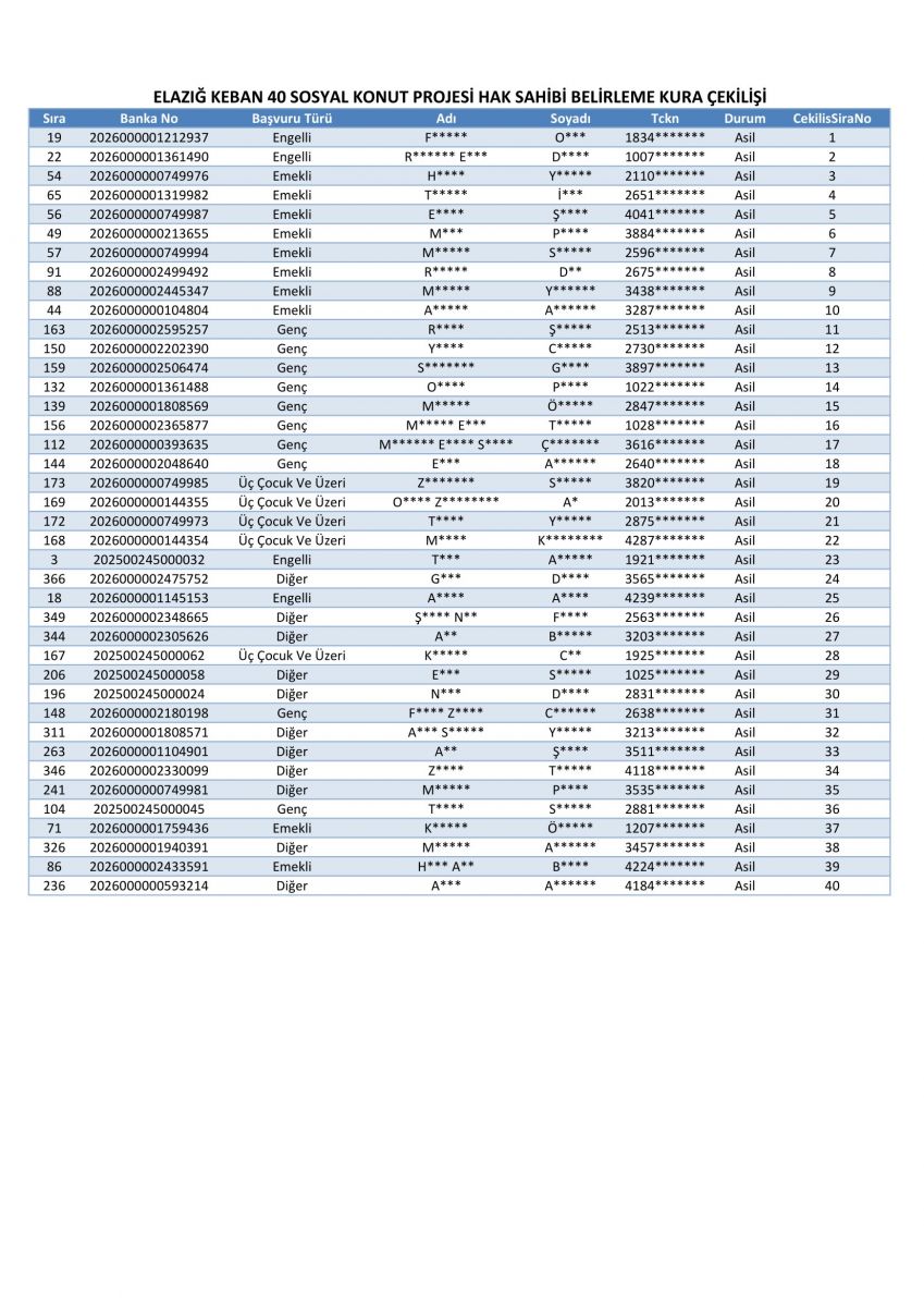 Keban 459 kişi başvurusunda 392 kişinin başvurusu Kuraya katılmaya hak kazanırken, 67 Kişinin başvurusu Red edilerek kura dışı bırakıldı.